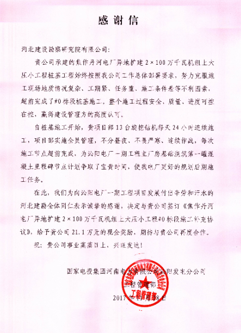 我公司承建的焦作丹河電廠異地擴(kuò)建2×100萬千瓦機(jī)組上大壓小工程樁基工程,始終按照業(yè)主工作總體部署要求,努力克服施工現(xiàn)場地質(zhì)情況復(fù)雜、工期緊、任務(wù)重、施工條件差等不利因素,超前完成了#0標(biāo)段樁基施工,整個施工過程安全、質(zhì)量、進(jìn)度可控在控,贏得了建設(shè)管理方的高度認(rèn)可。11月28日,國家電投集團(tuán)河南電力有限公司沁陽發(fā)電分公司工程管理部發(fā)來感謝信,對我公司項(xiàng)目部員工表示感謝,并期待與我公司的再度合作。