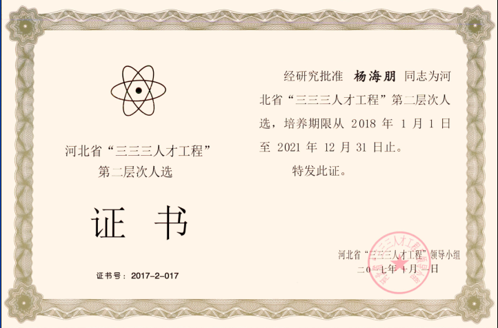經公司推薦,河北省人力資源和社會保障廳組織評審,河北省“三三三人才工程”領導小組批準、公司楊海朋榮獲河北省“三三三人才工程”第二層次人選。