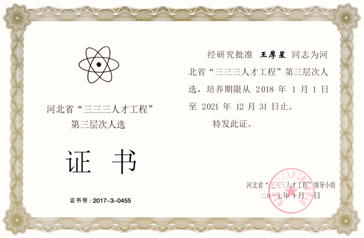 經公司推薦,石家莊市人力資源和社會保障局組織評審,報請河北省“三三三人才工程”領導小組備案,公司王厚星榮獲河北省“三三三人才工程”第三層次人選。