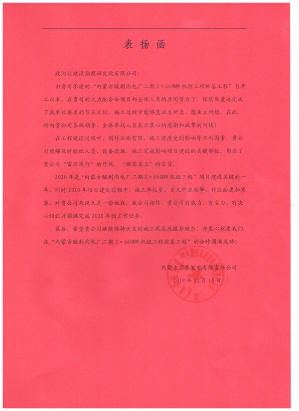 近日,由我公司承建的內(nèi)蒙古酸刺溝二期2×660WM機組工程樁基工程收到甲方內(nèi)蒙古京泰發(fā)電有限公司的表揚信,對項目部全體員工的辛勤付出,給予了高度認(rèn)可和評價,并為后續(xù)雙方的合作奠定了良好基礎(chǔ)。這充分彰顯了河北建勘人“雷厲風(fēng)行”的作風(fēng),“顧客至上”的宗旨。我們將繼續(xù)保持我們的施工風(fēng)范和服務(wù)理念,再接再厲,圓滿完成后續(xù)施工任務(wù)!