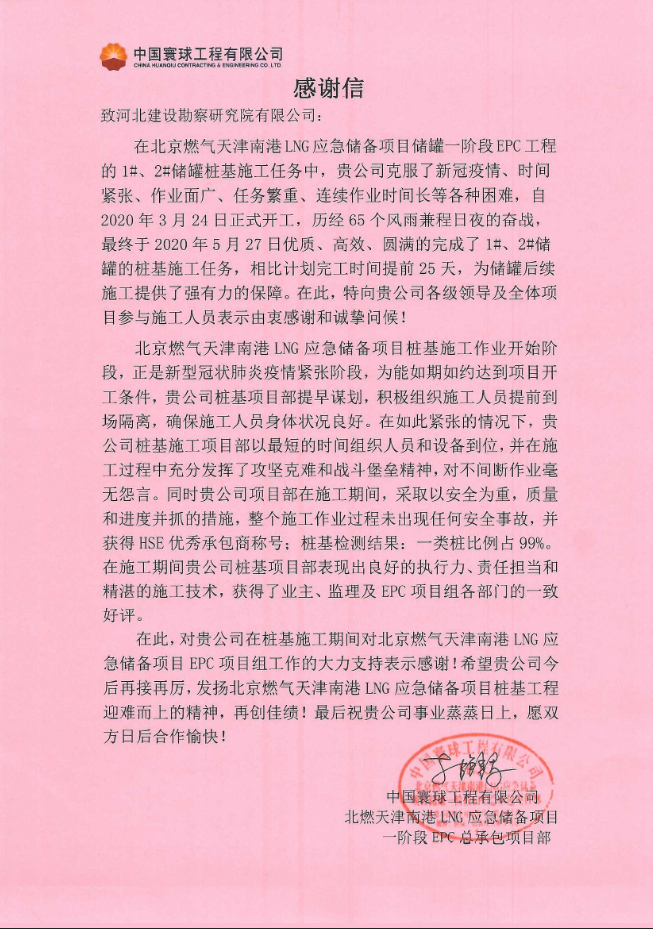 由我公司承建的北京燃氣天津南港LNG應急儲備項目1#、2#儲罐樁基工程,自2020年3月24日正式開工,歷經65個日夜的奮戰,最終于2020年5月27日優質、高效、圓滿的完成了1#、2#儲罐的樁基施工任務。中國寰球工程有限公司北京燃氣天津南港LNG應急儲備項目儲罐一階段EPC項目組,對我公司北燃樁基項目組表示由衷的感謝,感謝我公司領導及全體項目施工人員的辛勤付出,在克服了新冠疫情、時間緊張、作業面廣、任務繁重、連續作業時間長等各種困難的情況下,奮勇向前,較原定工期提前25天完成施工任務,為項目后續施工帶來了強有力的工期保障。同時對我公司在樁基施工期間對北京燃氣天津南港LNG應急儲備項目EPC項目組工作的大力支持表示感謝!希望我公司今后再接再厲,繼續發揚迎難而上的精神,再創佳績!