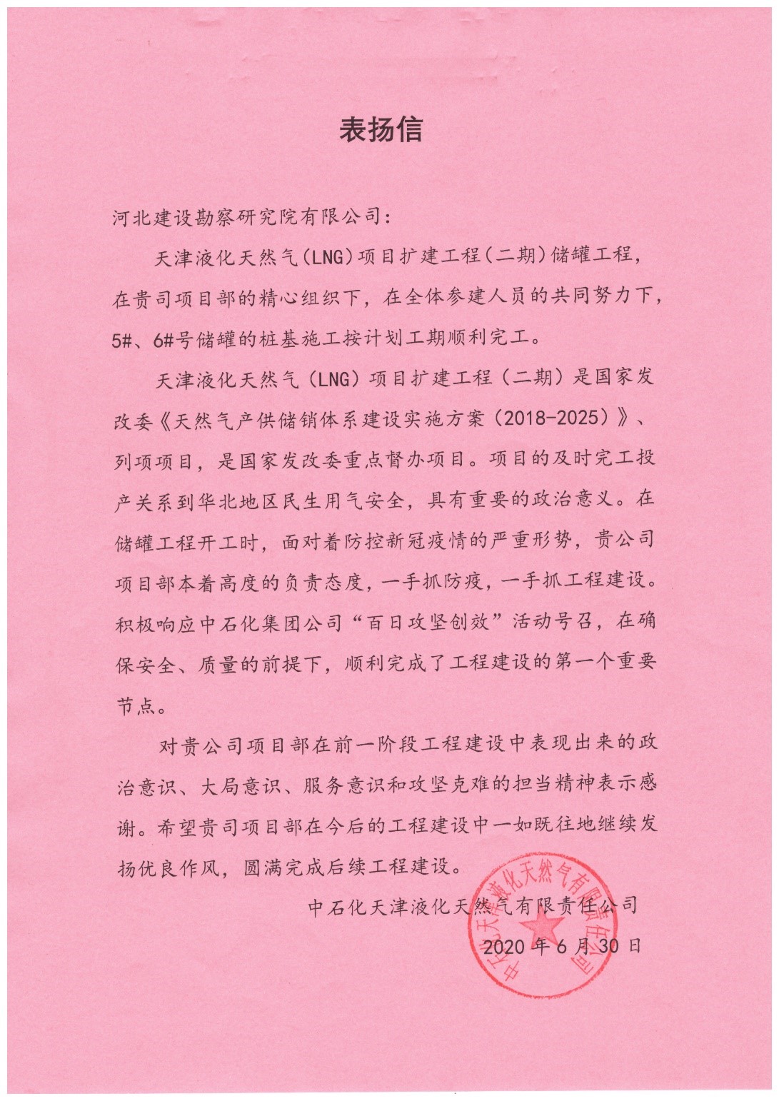 公司承建的天津液化天然氣(LNG)項目擴建工程(二期)5#6#罐樁基工程,自2020年4月5日正式開工,歷經83個日夜的奮戰,最終于2020年6月26日優質、高效、圓滿的完成了5#6#罐的樁基施工任務。中石化天津液化天然氣有限責任公司,對我公司中石化天津LNG二期項目部提出表揚,表揚我公司領導及全體項目施工人員對項目高度負責的態度,一手抓防疫,一手抓工程建設,積極響應中石化集團公司“百日攻堅創效”活動號召,在確保安全、質量的前提下,順利完成了工程建設的第一個重要節點。同時對我公司在前一階段工程建設中表現出來的政治意識、大局意識、服務意識和攻堅克難的擔當精神表示感謝。希望我公司在今后的工程建設中一如既往地繼續發揚優良作風,圓滿完成后續工程建設。