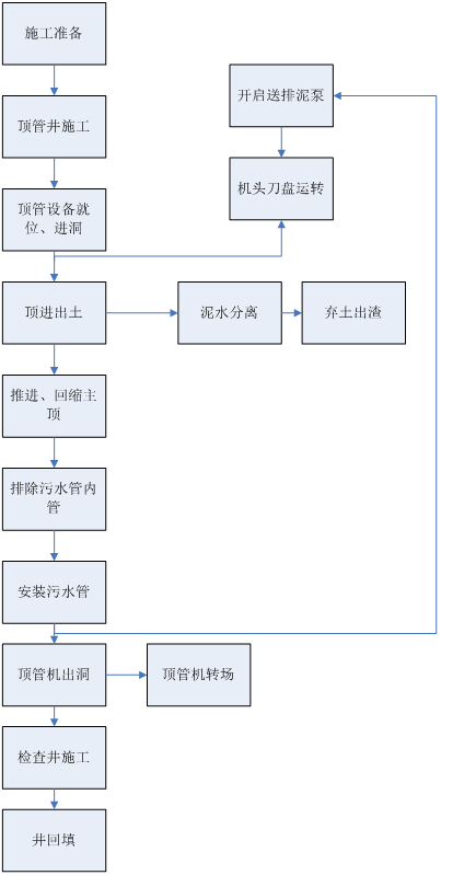 作為本次工程項目運用泥水平衡頂管機的施工技術(shù)工藝流程圖,前期準(zhǔn)備、工作井、接收井施工、設(shè)備就位、安裝止水膠圈、進(jìn)洞、頂進(jìn)出土、分離泥水、回縮主頂、安裝頂管、頂管機出洞轉(zhuǎn)場,進(jìn)行檢查井施工后回填。