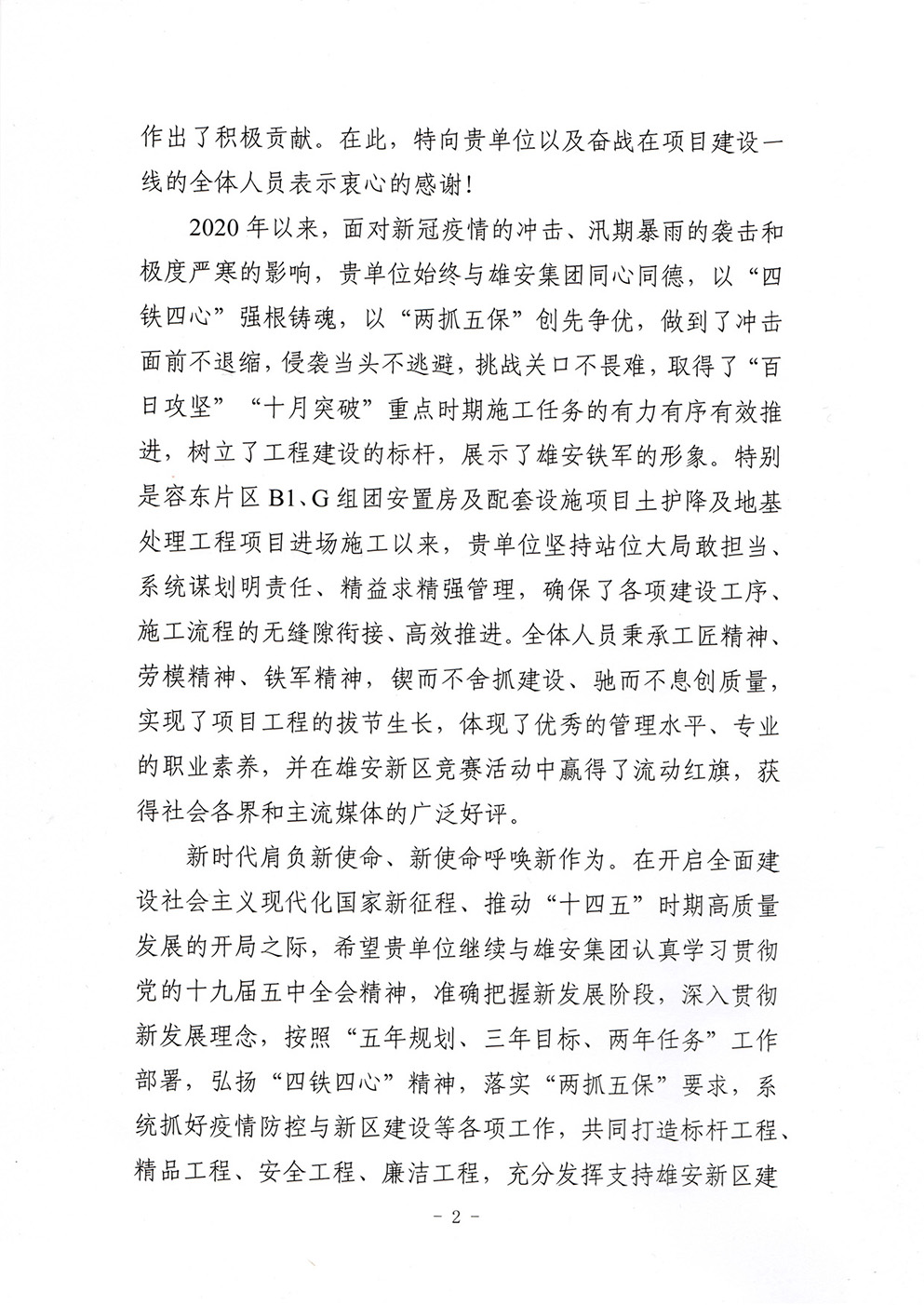 公司收到中國雄安集團(tuán)有限公司感謝信