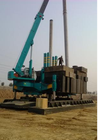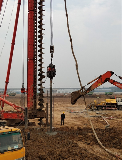 本工程2#、3#廠房樁基成孔采用長(zhǎng)螺旋后插筋工藝,混凝土壓灌完成后,進(jìn)行鋼筋籠安放工作,鋼筋籠安放采用25T吊車和振桿、震動(dòng)器(采用閉合式鏈接)配合進(jìn)行。鋼筋籠下入孔中后,保證在孔內(nèi)居中,先由鋼筋籠量與振錘自身的重量讓鋼筋籠自行下沉,當(dāng)不能自行下沉?xí)r(約達(dá)到3/1-3/2籠長(zhǎng)時(shí)),立即開動(dòng)震錘,邊振動(dòng)混凝時(shí)鋼筋籠邊隨著下沉,鋼筋籠隨著振動(dòng)下沉至到樁頂標(biāo)高位置后,采用雙吊筋固定鋼筋籠位置,緩慢將導(dǎo)管從樁身中拔出,并開動(dòng)震錘,即完成了該樁的施工。當(dāng)遇見孔口下沉現(xiàn)象時(shí),先用人工清理出表面混凝土,再由鉆機(jī)開至孔口進(jìn)行補(bǔ)方。