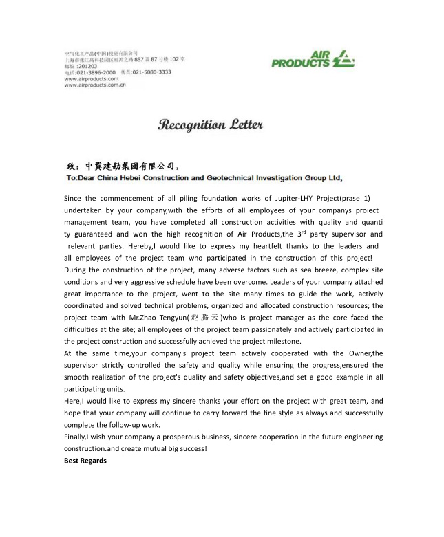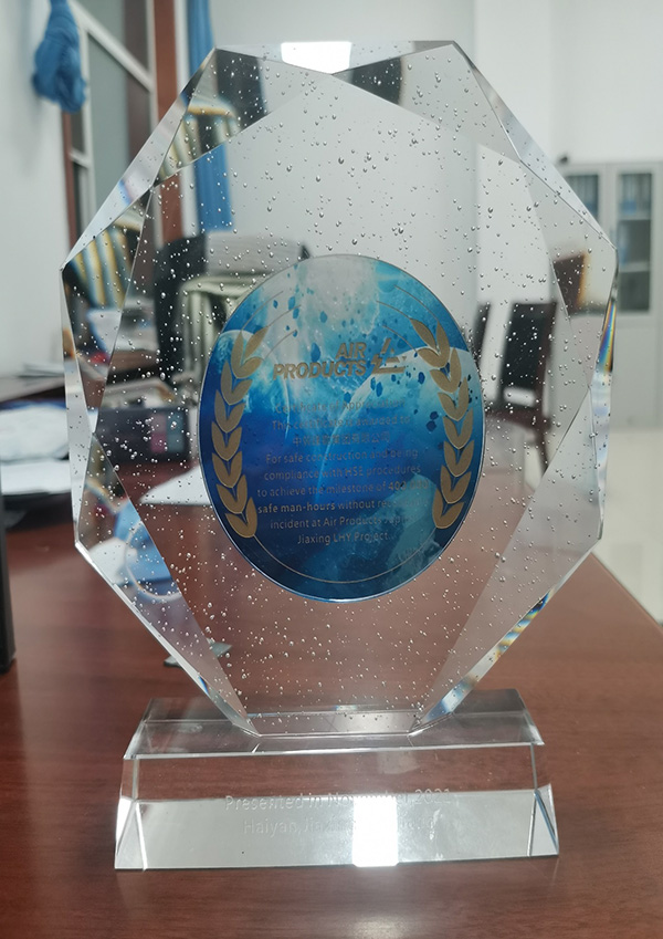 近日,我公司承建的空氣化工產(chǎn)品(浙江)有限公司海鹽氫能源和工業(yè)氣體綜合項(xiàng)目一期工程,收到業(yè)主頒發(fā)的“達(dá)到400000安全人工時”優(yōu)秀團(tuán)隊(duì)獎杯和表揚(yáng)信。