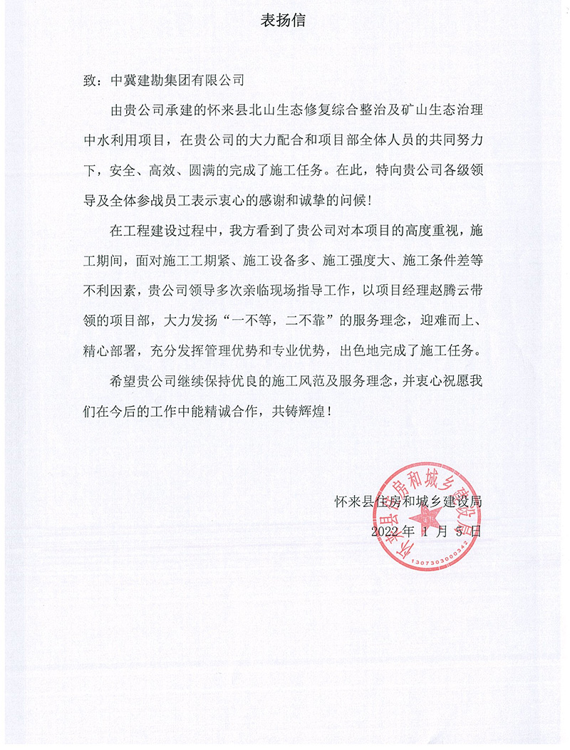 懷來縣北山生態(tài)修復(fù)綜合整治及礦山生態(tài)治理中水利用項(xiàng)目克服施工工期緊、施工設(shè)備多、施工強(qiáng)度大、施工條件差等不利因素,大力發(fā)揚(yáng)“一不等,二不靠”作風(fēng),迎難而上、精心部署,出色的完成了施工任務(wù),受到甲方領(lǐng)導(dǎo)的一致好評。