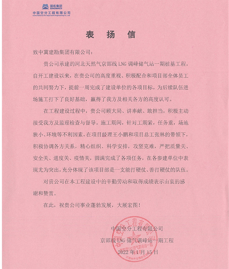 京邯線LNG儲氣調(diào)峰站一期項(xiàng)目樁基工程精心組織、科學(xué)安排、攻堅(jiān)克難,提前一周完工交付,為上部單位進(jìn)場施工打下良好基礎(chǔ),贏得了總包方及相關(guān)各方的高度認(rèn)可。