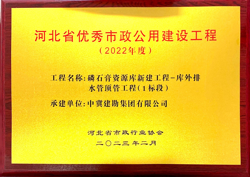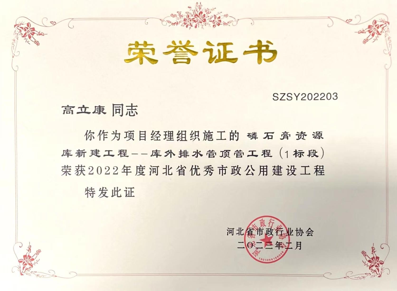近日,河北省市政行業(yè)協(xié)會發(fā)布消息,經(jīng)過審核申報材料、查驗施工現(xiàn)場、專家綜合評議,我公司市政工程項目“磷石膏資源庫新建工程——庫外水管頂管工程(1標段)”被評為河北省優(yōu)秀市政公用建設(shè)工程,并為項目經(jīng)理高立康同志頒發(fā)了榮譽證書。