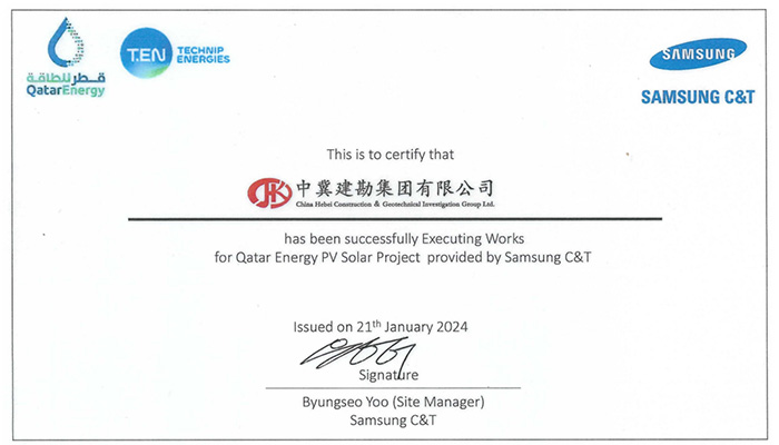 我公司收到卡塔爾能源875.5MW光伏發(fā)電項(xiàng)目業(yè)主方卡塔爾能源和總包方三星C&T公司聯(lián)合頒發(fā)的獎(jiǎng)杯和推薦信。業(yè)主及總包方高度認(rèn)可我公司項(xiàng)目履約能力,贊揚(yáng)我司對(duì)該項(xiàng)目成功交付做出重大貢獻(xiàn),表示愿意與我司建立長(zhǎng)期合作關(guān)系。基于我司卓越的履約表現(xiàn),三星C&T公司授予我司推薦信。