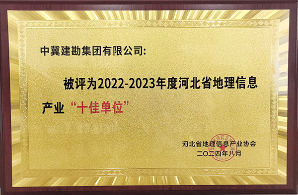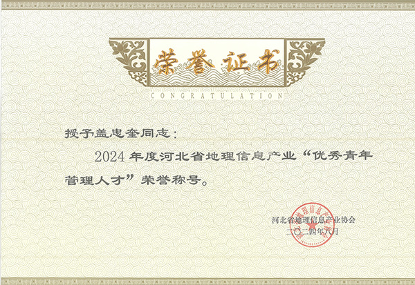 近期,由河北省地理信息產業協會評選,我公司被授予第五屆理事會“先進工作單位”榮譽稱號和2022-2023年度河北省地理信息產業“十佳單位”榮譽稱號,蓋忠奎同志榮獲2024年度河北省地理信息產業“優秀青年管理人才”稱號。